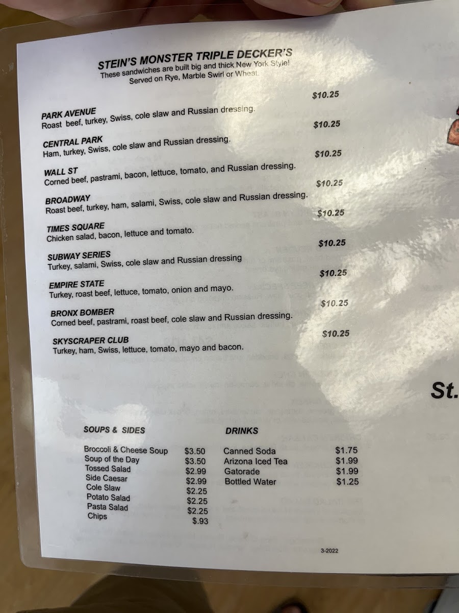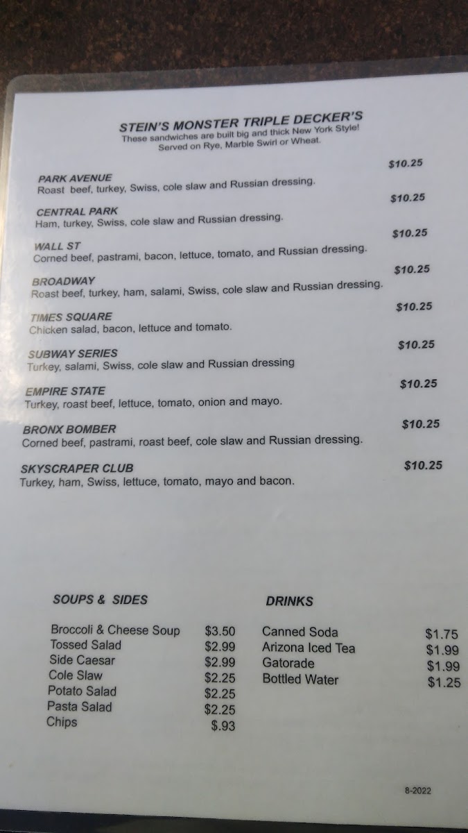The star of the menu is undoubtedly the Stein's Monster Triple Deckers, featuring options like the Park Avenue with roast beef and turkey, or the indulgent Wall St layered with corned beef and pastrami, all priced at just $12.15. Pair your meal with comforting soups, fresh salads, or classic sides like potato and pasta salad.